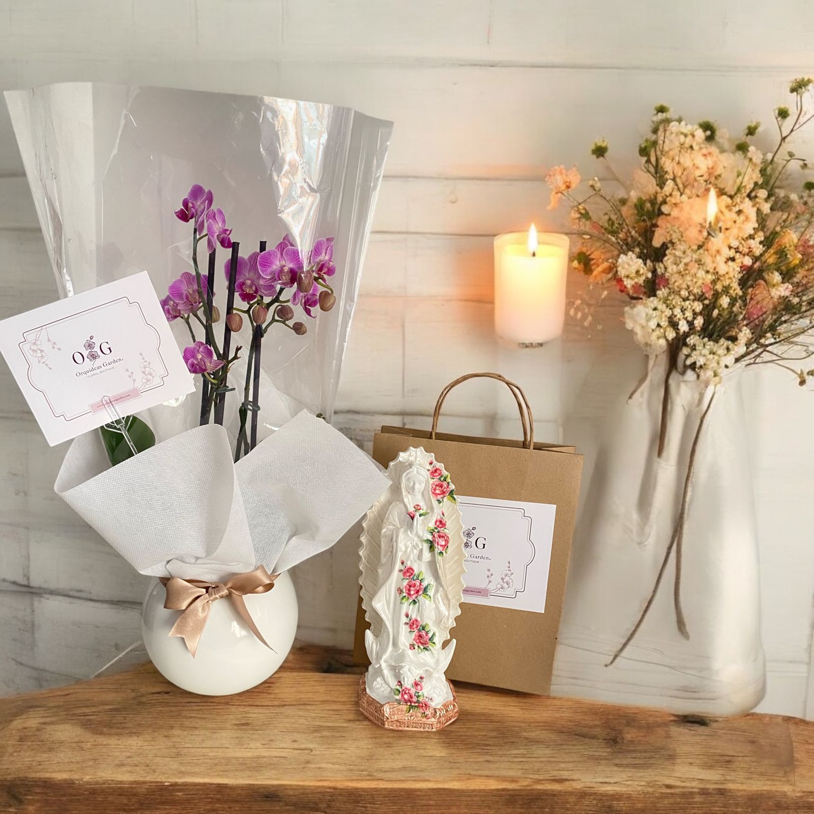 Virgen Yeso decorada de 22 cms + Orquideas medianas con base ceramica van empacadas para la ocasión con moño, tarjeta personalizada y recomendaciones de cuidados sin costo adicional