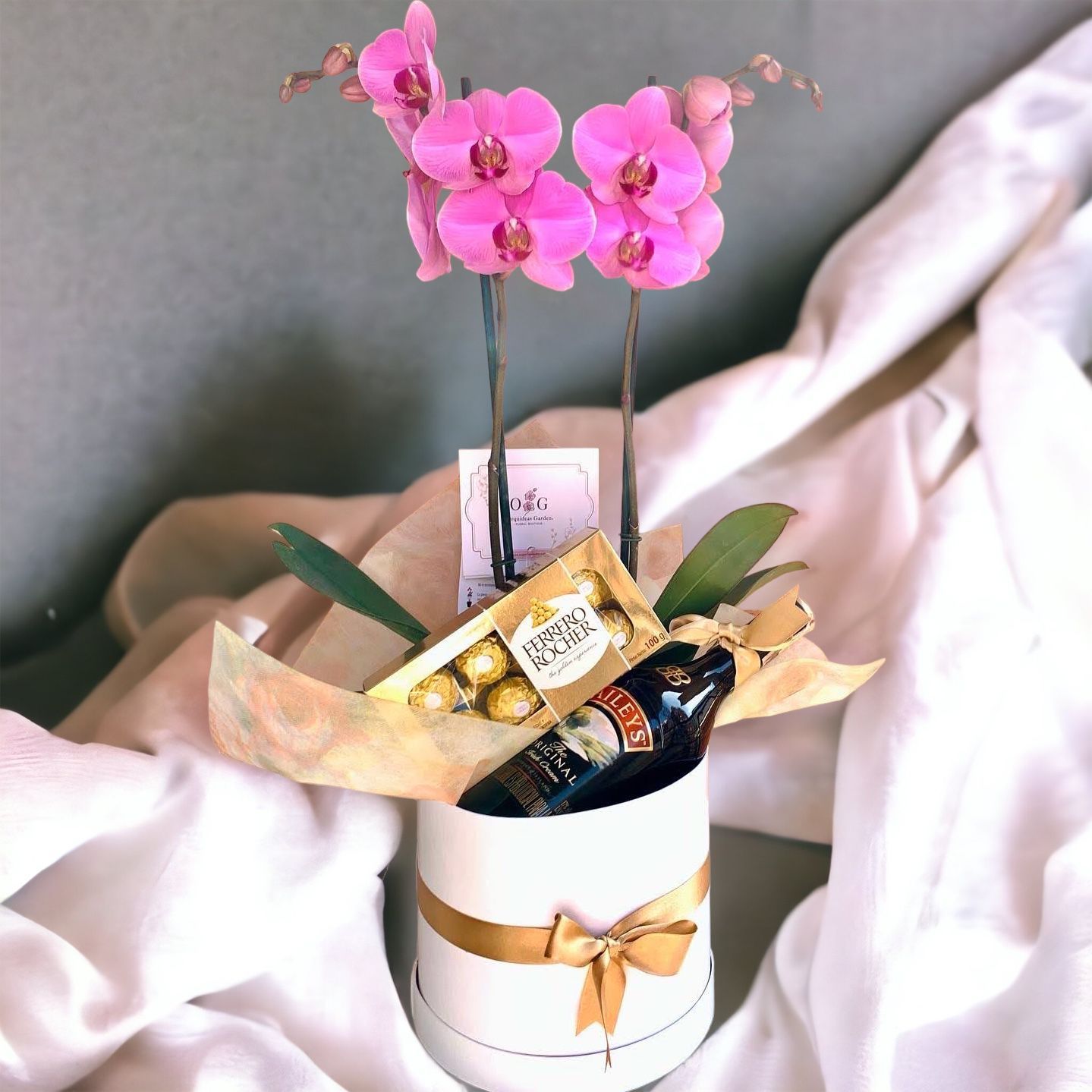 Nuestras Orquídeas van empacadas para la ocasión en una hermosa Gift Box, este arreglo contiene Orquideas Supreme dos varas , ferreros * 8 licor donde puedes escojer entre ( Baileys – Jp – Vino ) 700ml